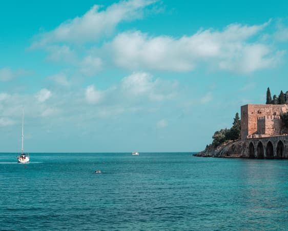 Alanya è una città termale sulla costa mediterranea centrale della Turchia (nota anche come la Riviera turca). Tra le sue ampie spiagge costellate di hotel si trova la spiaggia di Cleopatra dove, si dice, nuotava la regina egiziana. Il Castello di Alanya, una gigantesca fortezza dell'era Selgiuchide trasformata in un museo all'aperto, si trova su una scogliera rocciosa sulla linea di spiaggia, accanto alle ville ottomane con tetti rossi e alla Torre Rossa Ottagonale, un simbolo della città risalente al 1226.